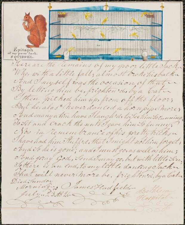 Слева: Джеймс Хэдфилд, «Эпитафия моему бедному Джеку, Бельчонку II»(1834). Бетлемский музей разума